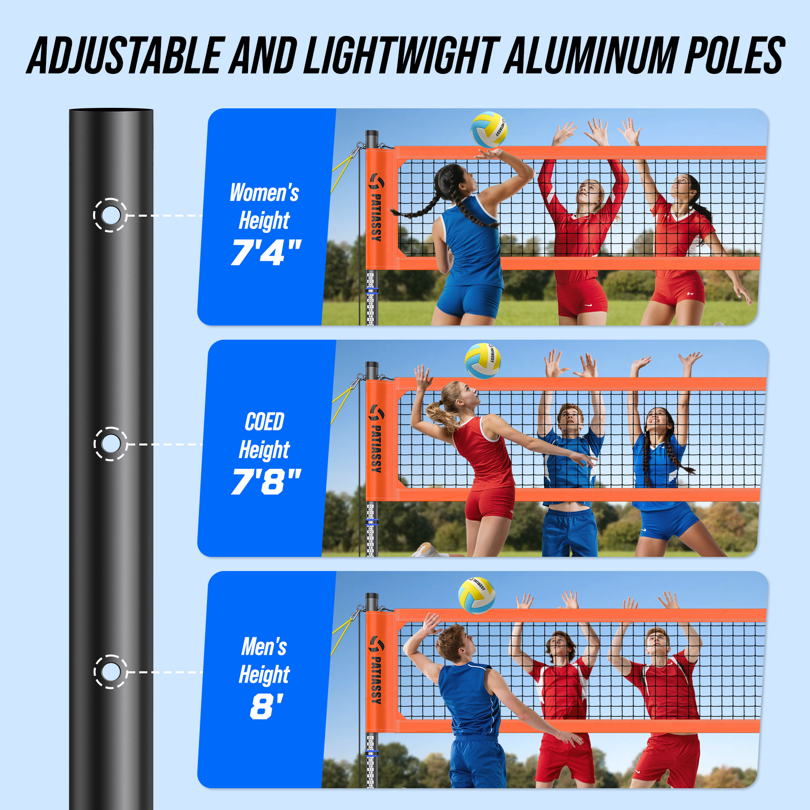 - Adjustable Height: This net is supported by 1.75-inch diameter telescoping poles that are made of aluminum with powder coating, more resistant to chipping, scratching and fading. Three height options: men’s(8′), women’s(7’4”), and co-ed(7’8”)